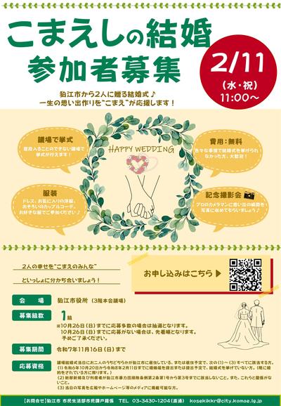 狛江市では、市に愛着を持っていただける環境づくりを推進しています。狛江市役所本会議場等で結婚式を挙げることにより、お二人の門出を温かく祝福するとともにお二人の一生の思い出として記憶に残り、狛江市に長く住み続けていただくことを目的としています。