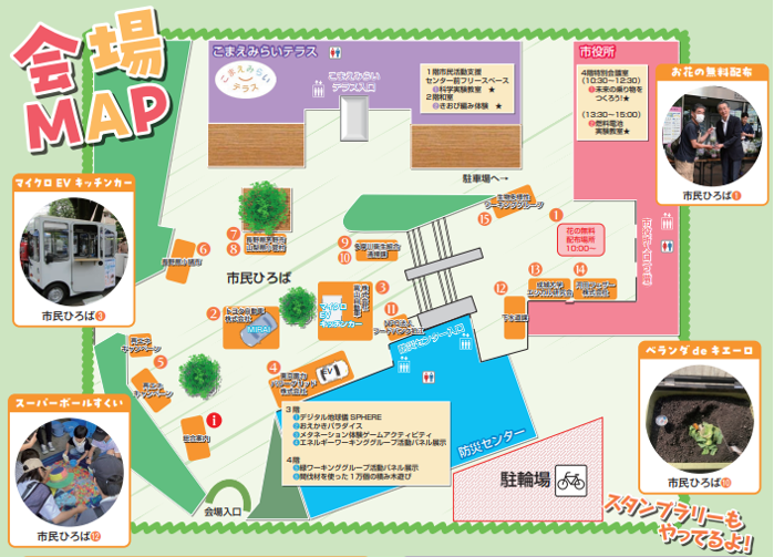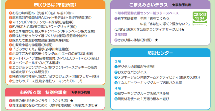 会場は市民ひろば、防災センター等となり、市民ひろばでは、「水素燃料自動車MIRAI(トヨタ自動車株式会社)」等の次世代モビリティの展示や「2050年脱炭素社会の実現に関する連携協定」を締結している長野県茅野市・小諸市の物産展、成城大学エシカル研究会による「エコショッピングゲーム」、河田フェザー(株)による「羽毛製品の回収」等の展示が、防災センターでは、地球の過去・現在・未来を映し出す「デジタル地球儀」の展示や自分の描いた魚がスクリーン上を泳ぐ「おえかきパラダイス」、東京ガス(株)による最新技術がゲームで学べる「いめたんゲーム」、間伐材からつくられた「1万個の積み木遊び」の出展など、多くの企業、団体の方々によりさまざまな出展が行われ、大きな賑わいの中で多くの視点から環境について学べる1日となります。