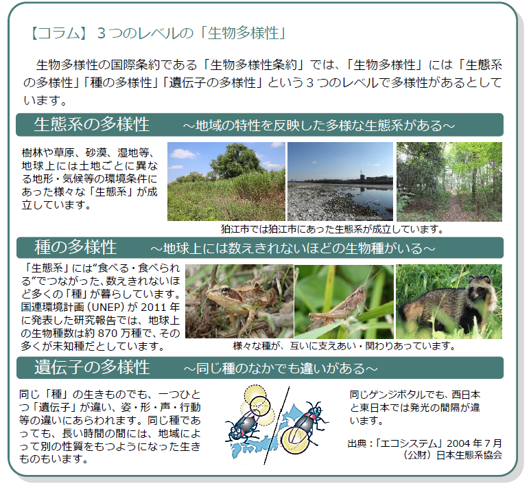 「生物多様性」にはたくさんの種類の生きものがいるだけではなく、様々な環境があること、そして同じ種類の生きものの中でも様々な遺伝子があることの3つのレベルの多様性があるとしています。