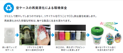 市内の公共施設に回収ボックスを設置し、ご家庭で使用したコンタクトレンズ空ケースを回収。回収した容器はリサイクル事業を行う業者へと運ばれ、様々なリサイクル品に生まれ変わります。