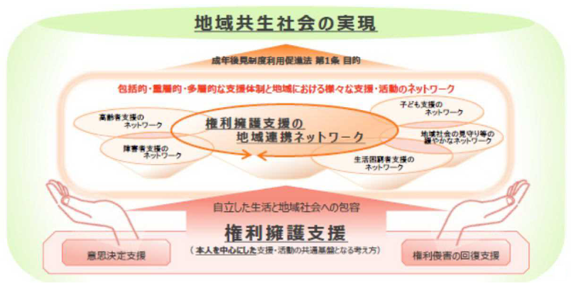 「権利擁護支援の必要な人の発見・支援」、「早期の段階からの相談・対応体制の整備」、「意思決定支援・身上保護を重視した成年後見制度の運用に資する支援体制の構築」という3つの役割を念頭に、既存の保健・医療・福祉の連携(医療・福祉につながる仕組み)に司法も含めた連携の仕組みを構築するものとされ、「チーム」「協議会」「中核機関」を構成要素とします。