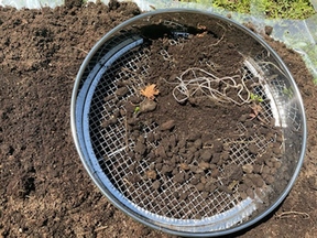 ![]() 2.土をふるいにかけて、虫や根っこ、鉢底石などを取り除く。 ふるいに残る土の塊や腐葉土は栄養になるため土に戻す。 |