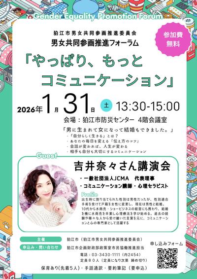 狛江市男女共同参画推進フォーラム 吉井奈々さん 講演会を実施します!