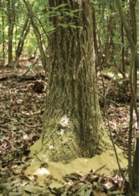 伐採からくん蒸処理までの流れは、樹木にカシノナガキクイムシが穿入した直径2mmほどの孔が開いていないかよく観察し、孔が確認された樹木の枝は枯死していないか、葉の茂り具合はどうか、樹木全体に活気があるか等を確認します。