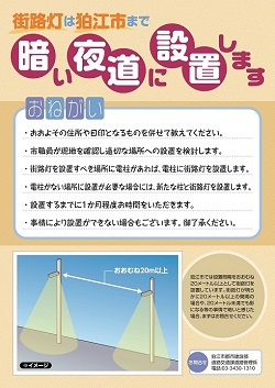 なお、街路灯設置のご要望をいただいてから予算の範囲内で街路灯を設置します。設置されるまで、数カ月程度時間を要します。
