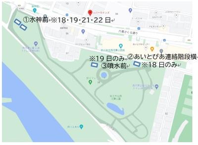 西河原公園内(水神前モニュメント、あいとぴあ連絡通路横、噴水前)