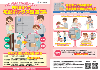 子どもの安全・安心対策に関する設備や子育て期の親同士の交流機会の創出に関する施設の設置に対する費用を補助します。また、子育て世帯の入居率が3割以上の既存の共同住宅等に対して、宅配ボックスの設置工事を補助します。
