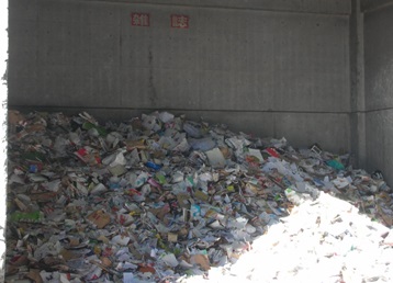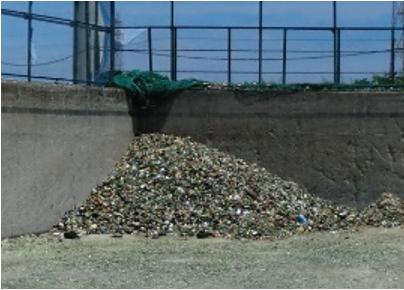 (2)「ビン・缶リサイクルセンター」でガラスと陶磁器類に分別して大きなトラックに積替えて再資源化する工場に運びます。