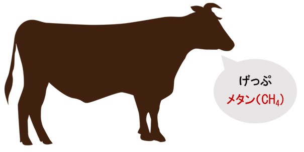牛から出るげっぷにはメタンが含まれています。メタンは二酸化炭素に次ぐ地球温暖化に及ぼす影響が大きい温室効果ガスであり、IPCCの第5次評価報告書によると、同じ量で二酸化炭素の約28倍、地球温暖化に影響を与えるといわれています。