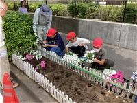 いずみ学級の児童が和泉本町一丁目町会や道路交通課の方々と協力し、正門前の花壇に126株の花の苗植えを行った取組です。苗植え作業だけで終わるのではなく、栽培委員の児童も加わり、水やりや雑草抜きを継続的に行っています。