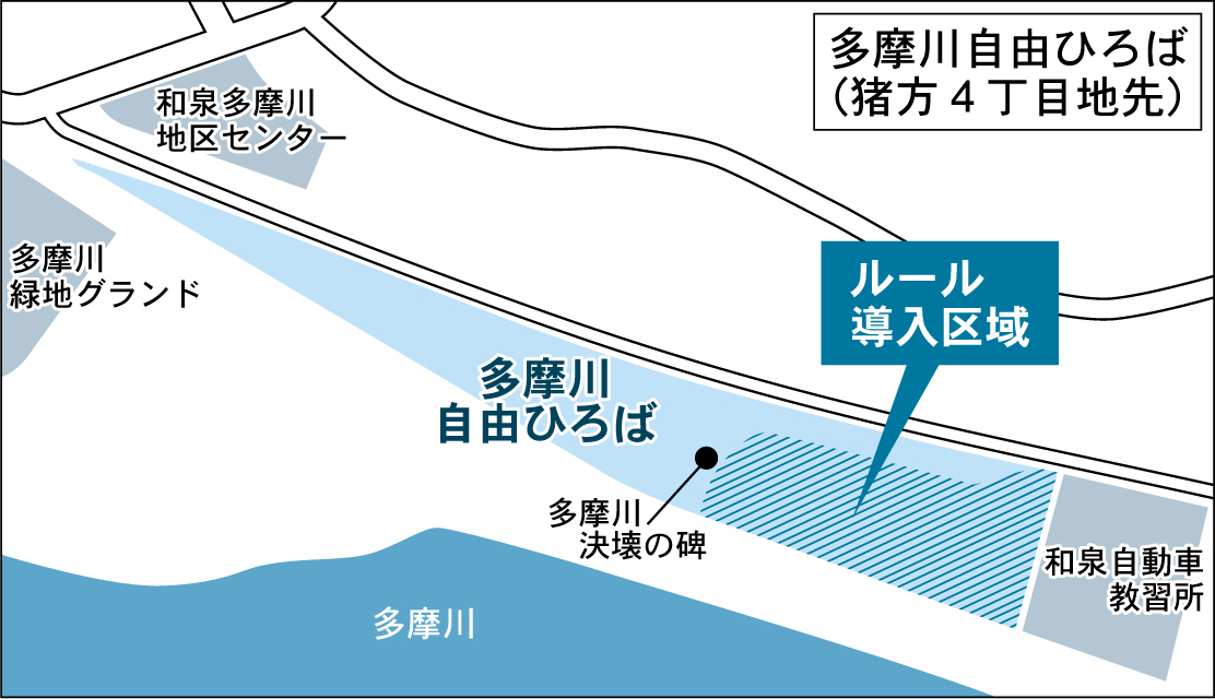 狛江市が管理している多摩川河川敷では原則としてボール遊びはできませんが、多摩川自由ひろばの下流区域(ルール導入区域)に限って、利用ルールに則ったボール遊びが可能です。