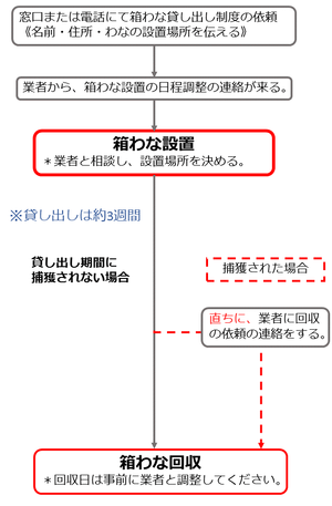 箱わな貸し出し制度の申請、箱わな設置から回収までの流れ