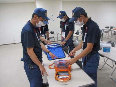 | 会場を巡回し、警戒活動を行っています。 | 有事に備え、AED等の用具の確認をしています。 |