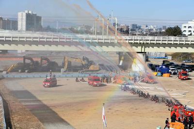 令和4年1月9日(日曜日)に多摩川河川敷にて、狛江市消防団出初式が行われました。3年ぶりに多摩川河川敷での実施となった出初式は天候にも恵まれ、非常に多くの方にご来場いただきました。
