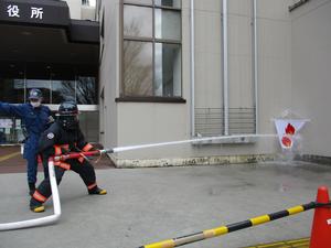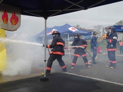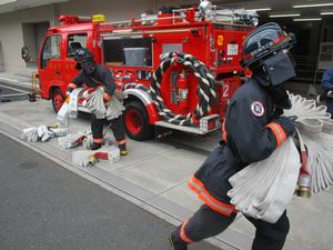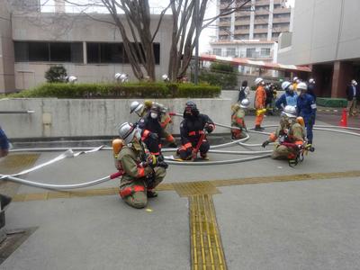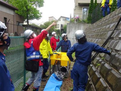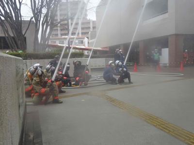 | 狛江消防署とともに放水準備を進めます。 | 想定された出火元への放水をいたしました。 |