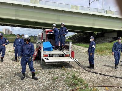 6月20日(日曜日)に令和3年度狛江市総合水防訓練が実施されました。狛江市消防団は、排水ポンプ車を活用した排水を行うための「排水ポンプ車運用訓練」及び多摩川で水難救助における技術向上を図ることを目的とした「舟艇訓練」を実施しました。
