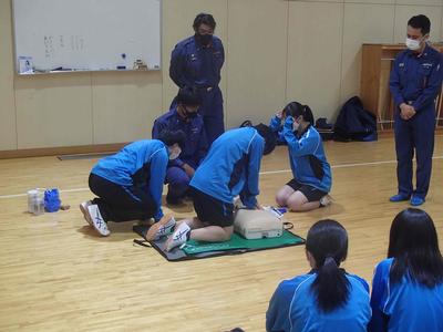 | 生徒は団員より救急蘇生法について学びます。 | 団員から丁寧な指導を受けます。 |