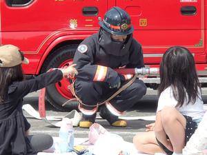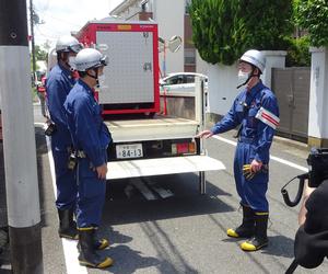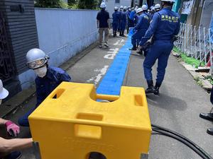 狛江消防署と連携して、想定された出火元への放水を行っています |