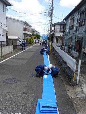 排水ポンプユニット搬出から、令和元年東日本台風で浸水が発生した地区への部署および排水ホース延長等の排水活動実施までの一連の流れを確認しています。