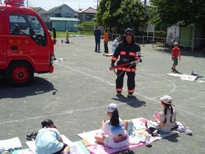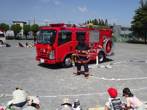 | 快晴の中、消防ポンプ車と消防団員を描いてくれています。 | 子どもたちから質問を受けるシーンもありました。 |