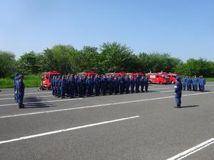 第25期の初めての合同訓練です。消防団員の基本となる規律訓練をはじめ、資機材操作訓練、消防ポンプ車による放水訓練を実施しました。