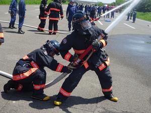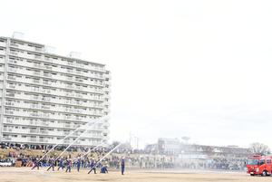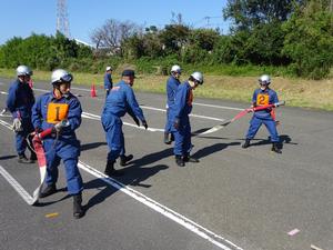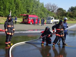 | 規律を学ぶことで、団結力を高めます。 | 放水訓練では、火事を想定して基礎をしっかり学びます。 | 出水に備え、排水ポンプ運用訓練も行いました。 |