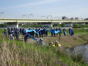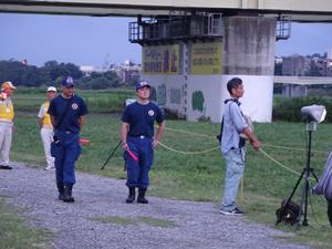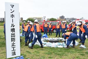 | 多摩川河川敷で行われ、様々な訓練が行われました。 | マンホール噴出防止工法を実演しました。 |