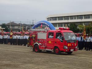 | 号令を待つ放水隊。第3分団が担当しました。 | パレードに参加する第8分団ポンプ車です。 |