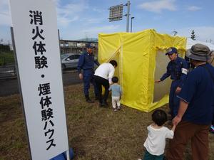 | 憧れの消防車に乗車体験。 | いざという時のために消火器体験。 | 煙体験ハウスで煙の怖さを体験。 |
