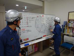 防災センター内に設置された本部では、 火災の状況を把握し各分団に指示を出します。 |