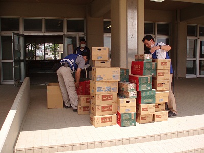 市民からの支援物資等を集積所に搬入 |