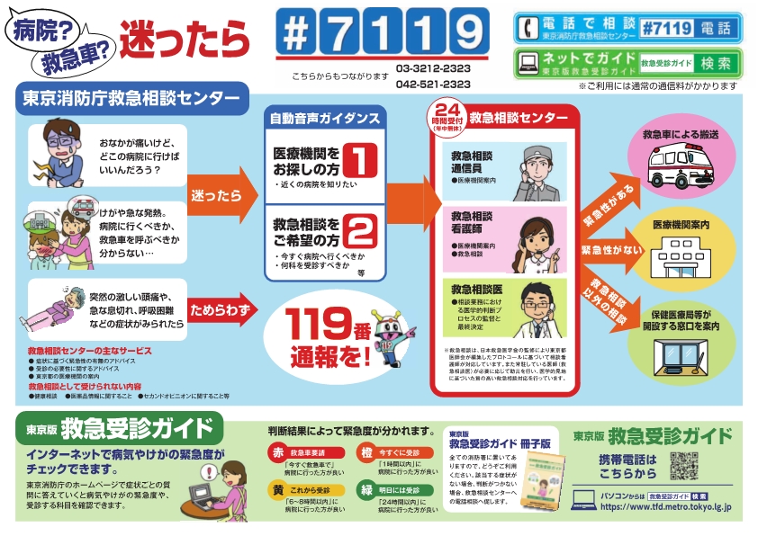 東京消防庁では、急な病気やけがをした場合に、「今すぐ病院に行ったほうがいいのかな?」、「救急車を呼んだほうがいいのかな?」など迷った際の相談窓口として、「東京消防庁救急相談センター(外部リンク)」を開設し、相談医療チーム(医師、看護師、救急隊経験者等の職員)が、24時間・年中無休で対応しています。