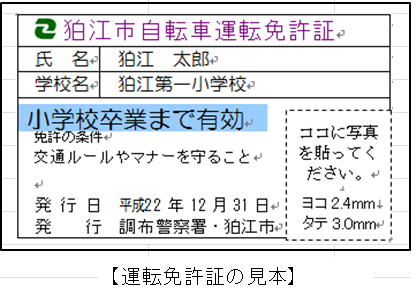 この教室を受講した児童には、自転車運転免許証を交付して、交通ルールとマナーを守った正しい自転車の乗り方を心がけていただくこととしています。