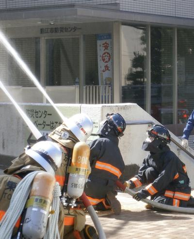 狛江市消防団は第3分団が出場し、ダミー人形を使用して庁舎内にいる方の救出や消防署と協力して放水訓練を行いました。