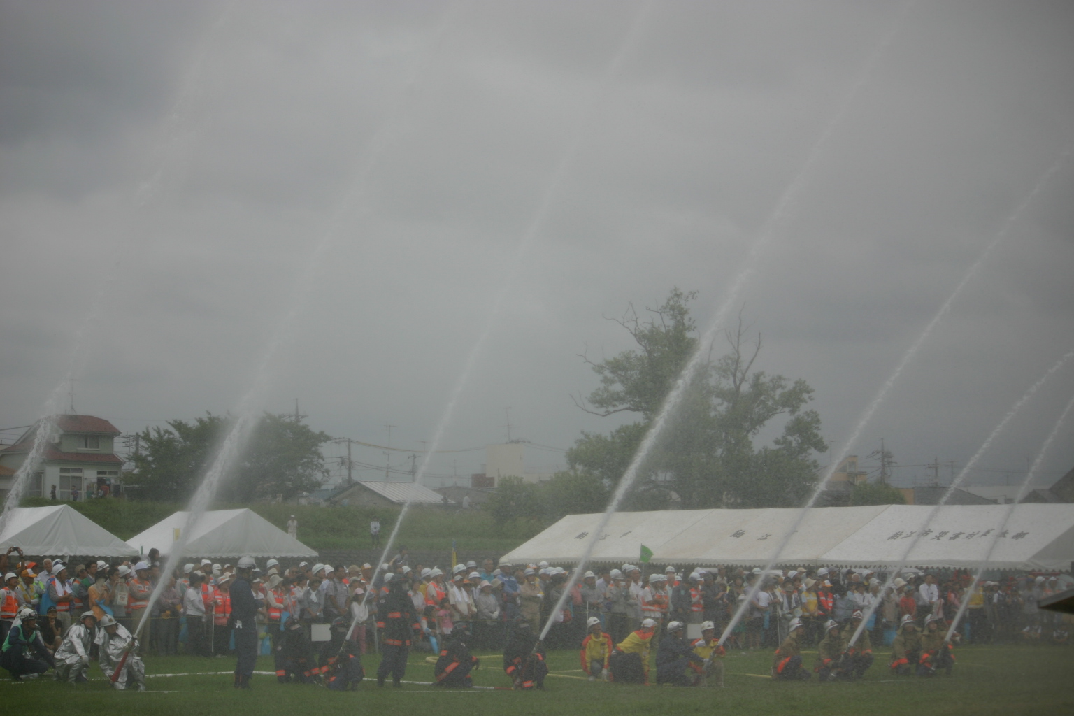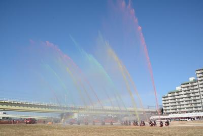 | ポンプ車操法の放水の様子 | 晴天の空を彩る圧巻の一斉放水 |