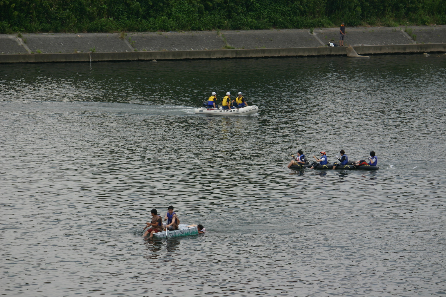 平成26年7月13日(日)に狛江古代カップ第24回多摩川いかだレースが実施され、狛江市消防団は、ボートによる警戒活動を行いました。また、終了後は水難事故に備え舟艇訓練を実施しました。
