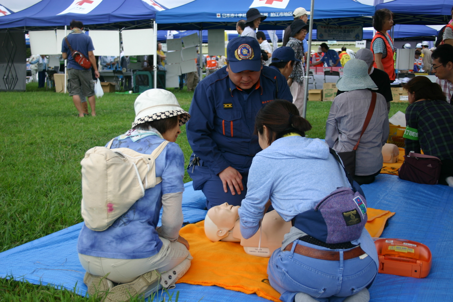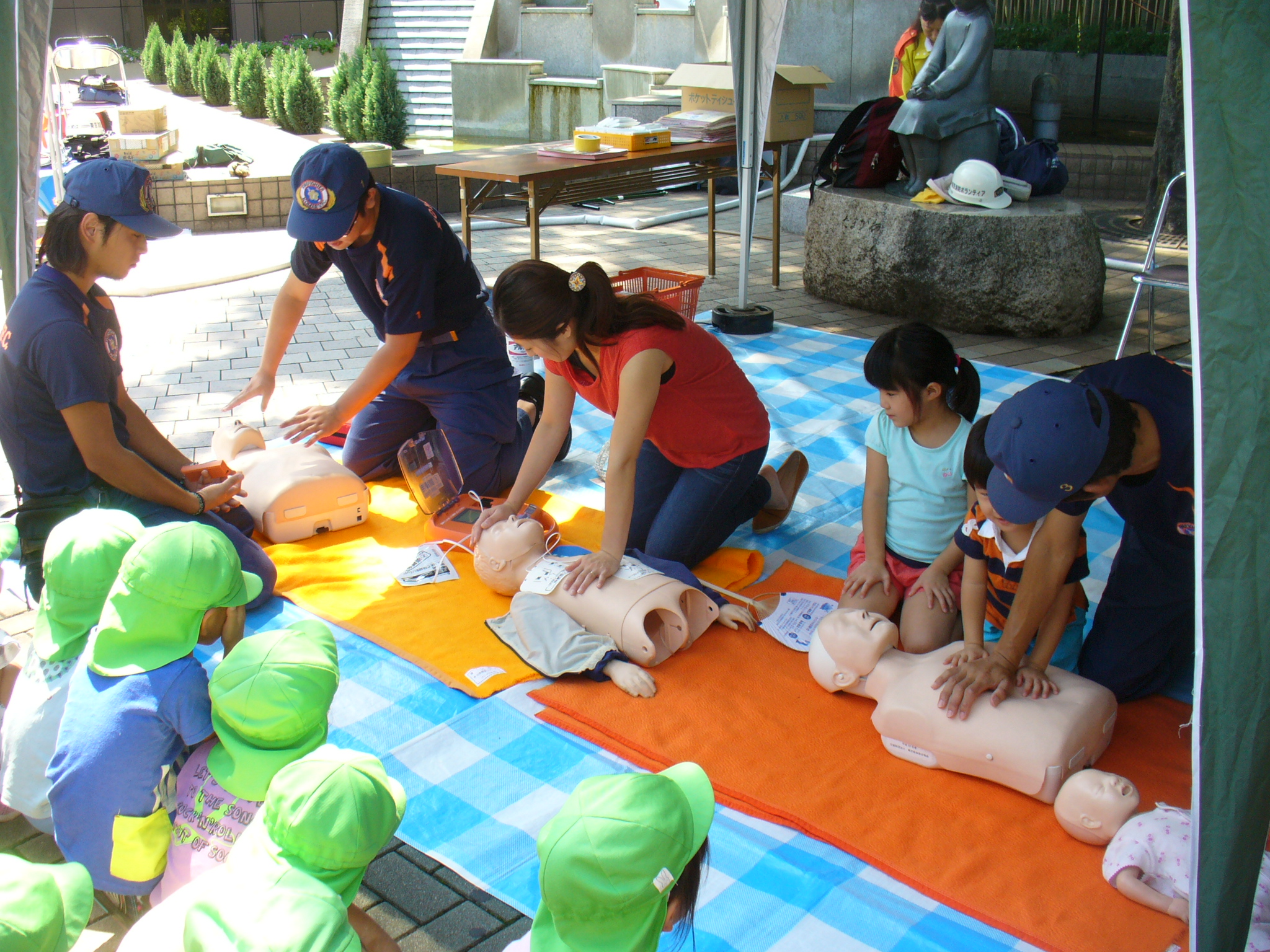 ダミー人形を使って心臓マッサージの練習 |