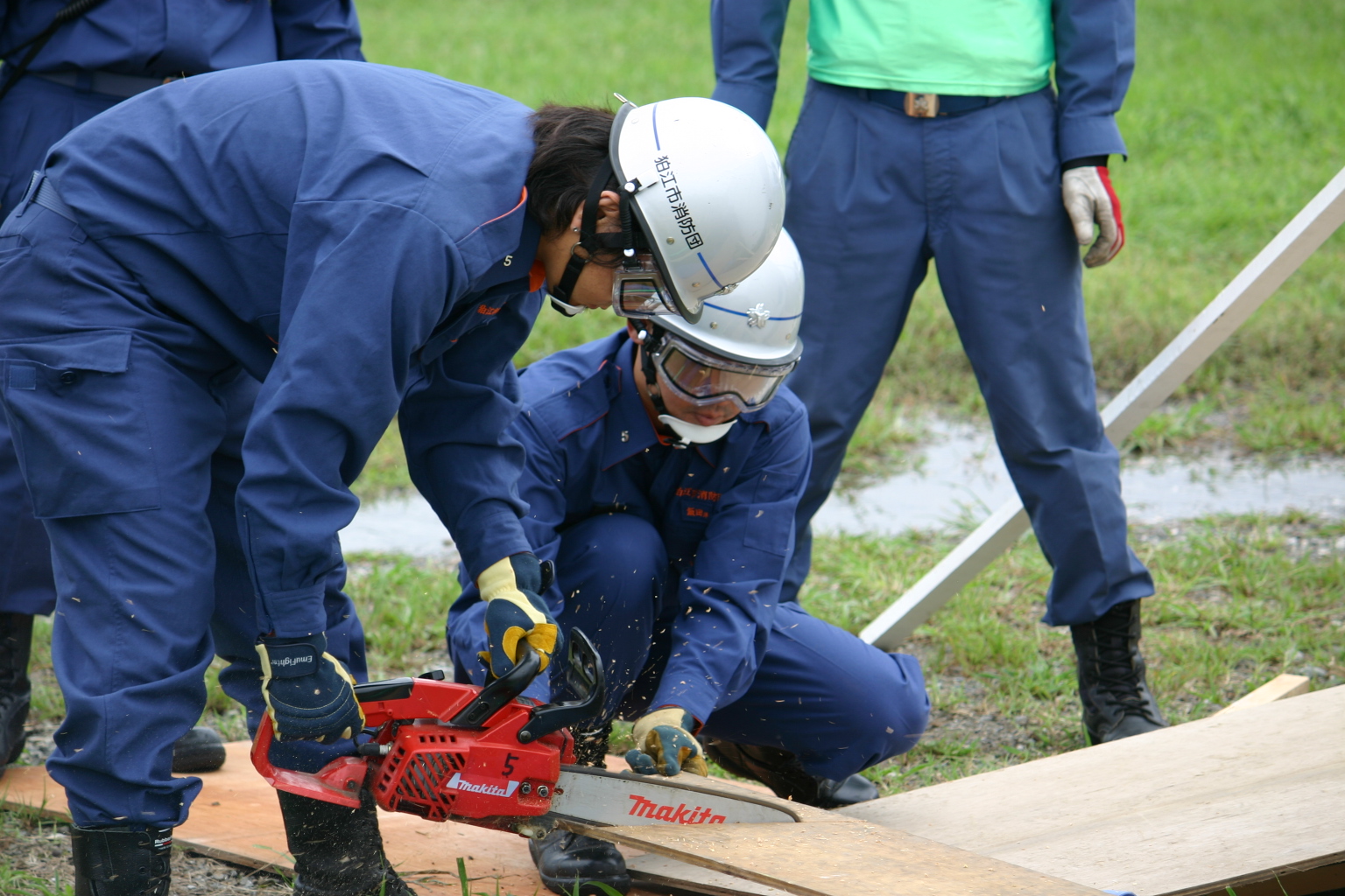 | チェーンソーを利用した救出救助活動 | 一斉放水 |