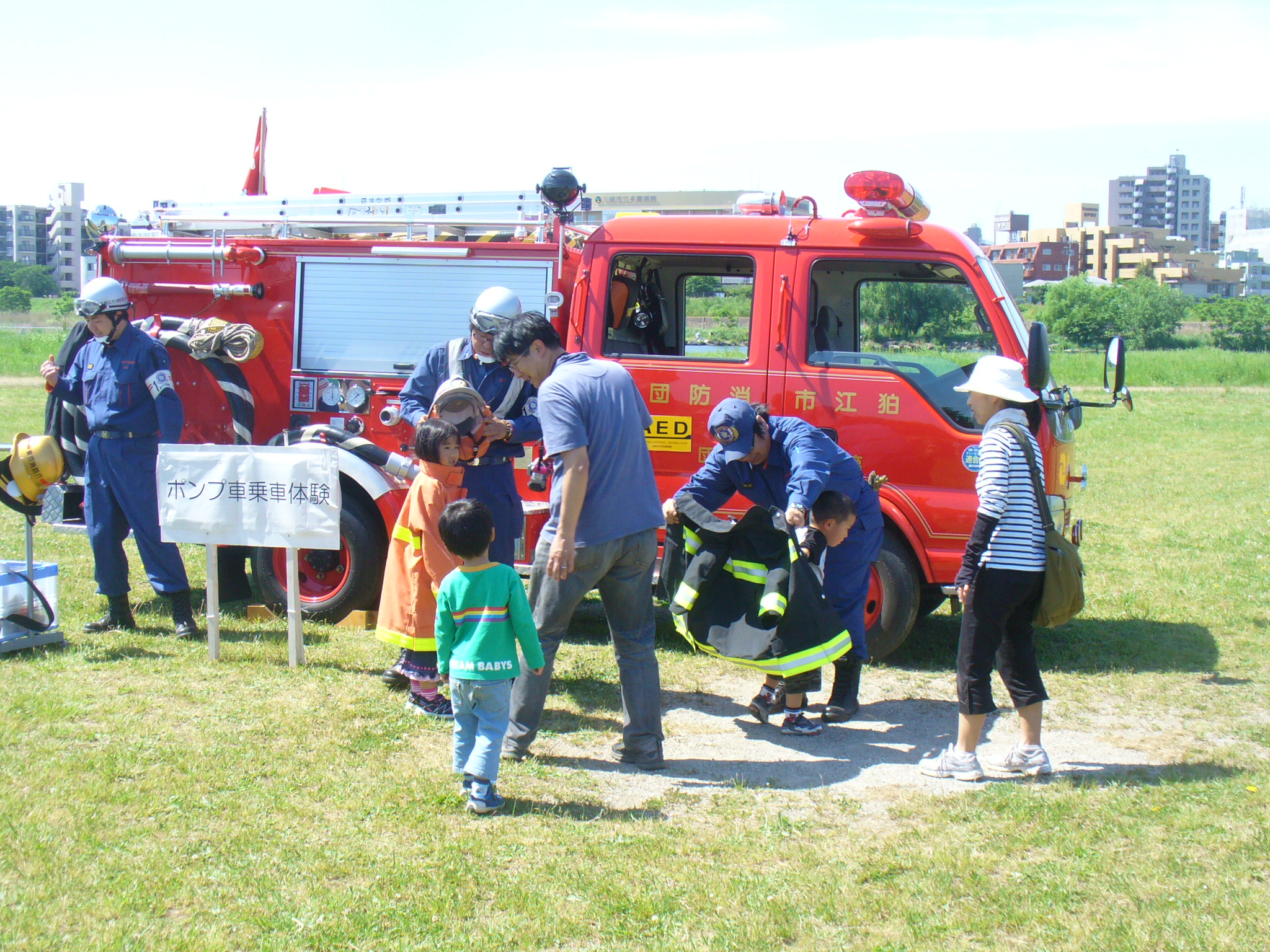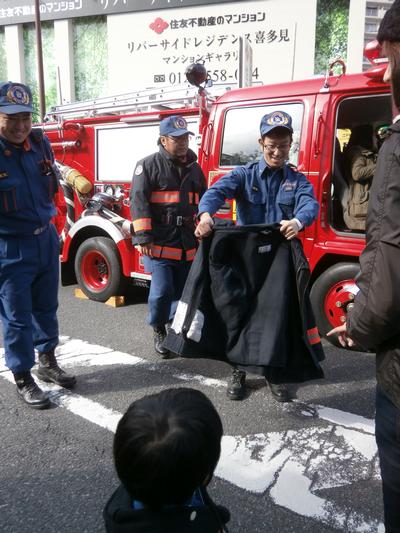 防火服の試着やポンプ車の展示を行いました |