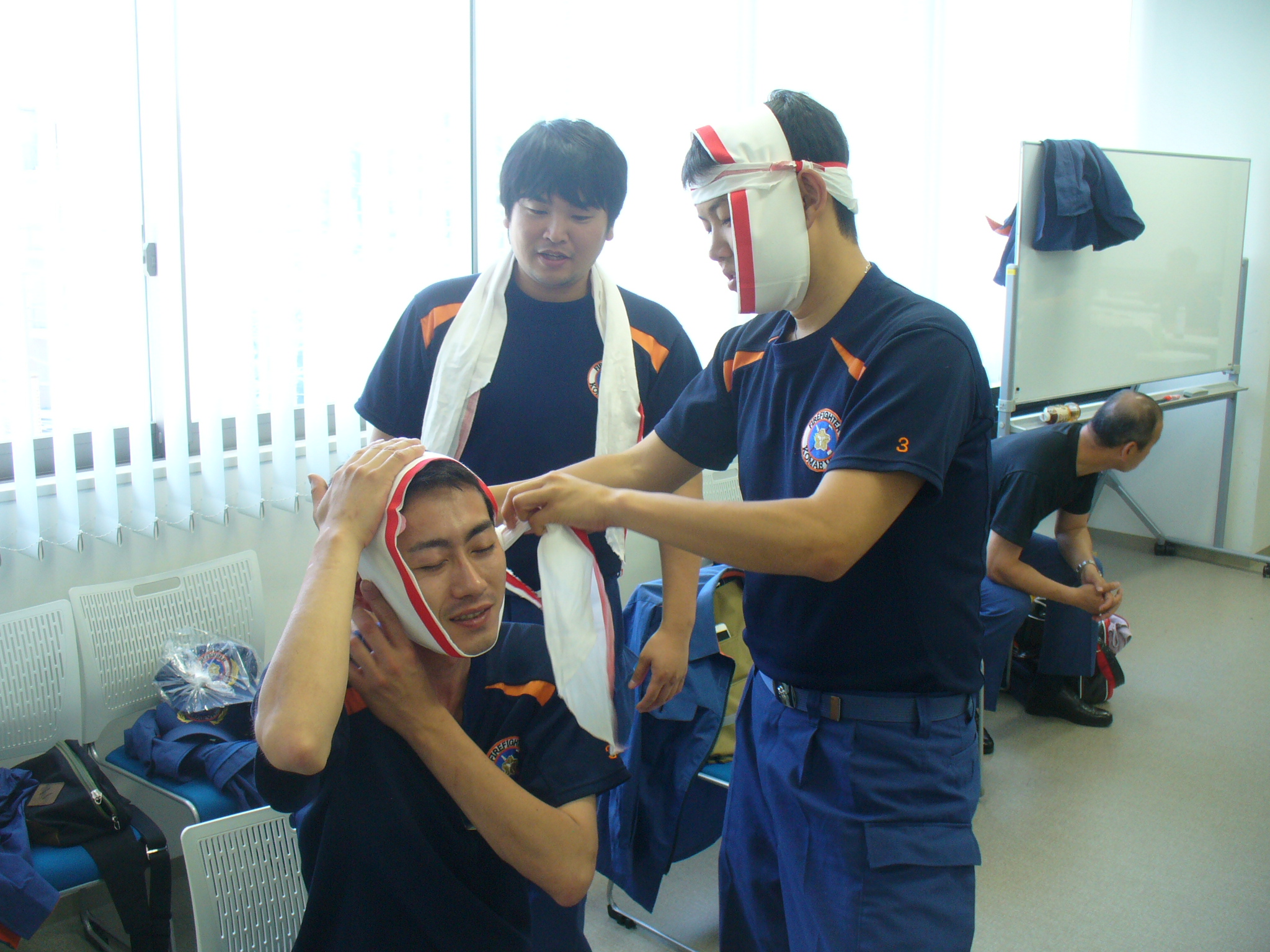 | 繰り返し練習します | 三角巾を利用した止血法の様子 |