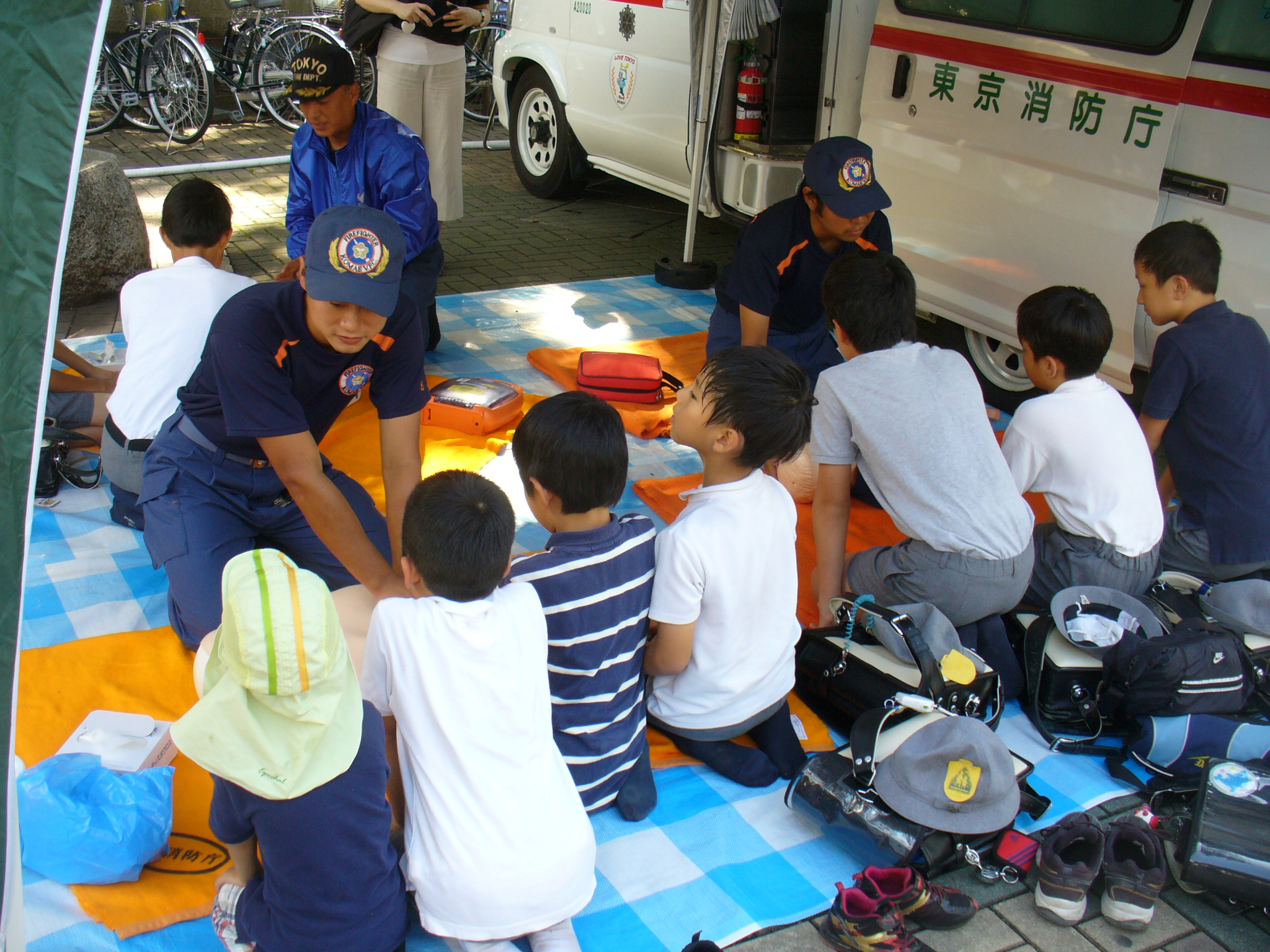 平成26年8月23日(土)に狛江市立狛江第三小学校にて実施された第二育成夏休み地域ふれあいひろば。狛江市消防団は、生徒や地域住民の皆様に応急救護の指導や防災の意識付けに貢献しました。