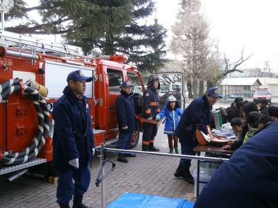 | ポンプ車展示の様子 | 未来の消防団員さんになってくれるかな |