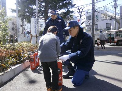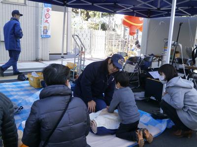 狛江市消防団では、第5分団と第8分団が参加し、消火器の使い方の指導やAEDや救急救命の指導を行いました。当日は子どもから大人まで多くの方が訪れ、使用方法などを学びました。
