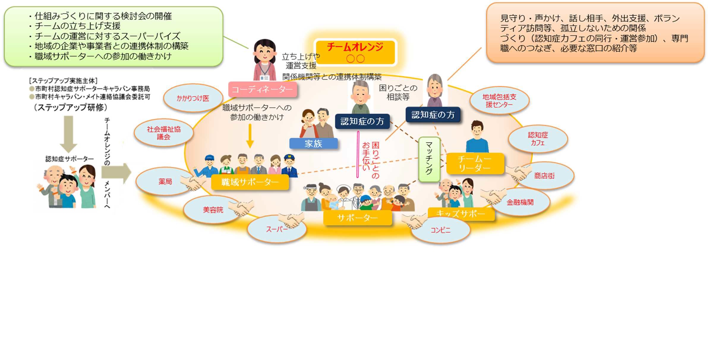 チームオレンジとは、認知症と思われる初期の段階から、心理面・生活面の支援として、市町村がコーディネーターを配置し、地域において把握した認知症の方の悩みや家族の身近な生活支援ニーズ等と認知症サポーター(基本となる認知症サポーター養成講座に加え、ステップアップ講座を受講した者)を中心とした支援者をつなぐ仕組みです。