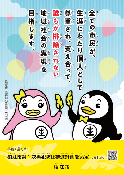 狛江市では、「全ての市民が、生涯にわたり個人として尊重され、支え合って、誰もが排除されない地域社会の実現を目指します。」を基本理念とし、出所者等が再び犯罪を起こすことなく、地域で安心して暮らしていけるよう支援を行うことで、再犯を防止し、地域住民全体が「安心して暮らせる安全なまち」を実現するため、令和6年3月に狛江市第1次再犯防止推進計画を策定しました。
