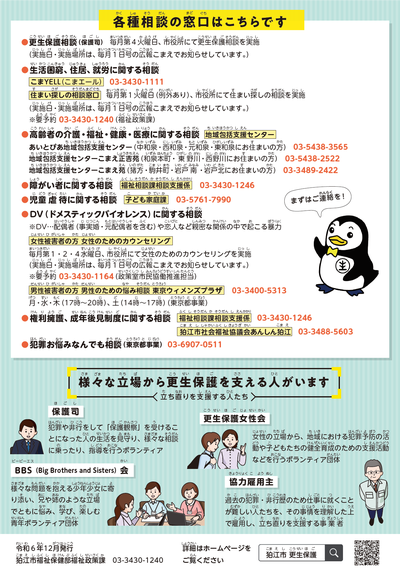 再犯防止推進チラシは、罪を犯した人が在所中や出所後、困難や悩みを抱えた際に相談できる窓口や支援機関等を紹介しているものです。