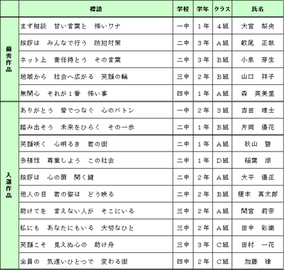 市内4中学校から、526作品のご応募をいただきました。その中から、優秀作品5編、入選作品10編を選び、7/21(月・祝)に開催した社会を明るくする運動狛江市推進大会とコンサートで表彰しました。