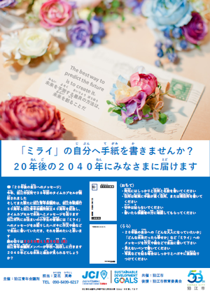 このタイムカプセルは狛江青年会議所創立40周年、狛江市制施行50周年を記念して設置しました。狛江市の小学生を対象とし、「20年後の自分へのメッセージ」をテーマに、未来の自分への手紙を書いてもらいました。