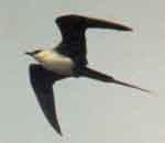 海洋上で生活し、他の海鳥をおそって食物を奪うところからこの名がついています。1990年5月初旬、海が荒れたとき多摩川に飛来しました。内陸での観察はきわめてまれです。全長53センチ。くちばしの先端がかぎ型で、尾羽の中央が長く伸びており、背面は黒っぽく、白い腹をしています。