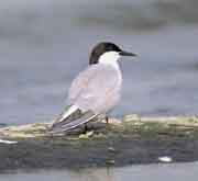 多摩川では、渡りの時期の5月と9月頃、しばしば観察されます。全長36センチ。背と翼の上面はうすい灰色です。頭は黒くコアジサシによく似ていますが、一回り大きく夏羽は帽子をかぶったように目の線まで頭が黒く、またくちばしも黒いところは異なります。冬羽は額が白くなります。
